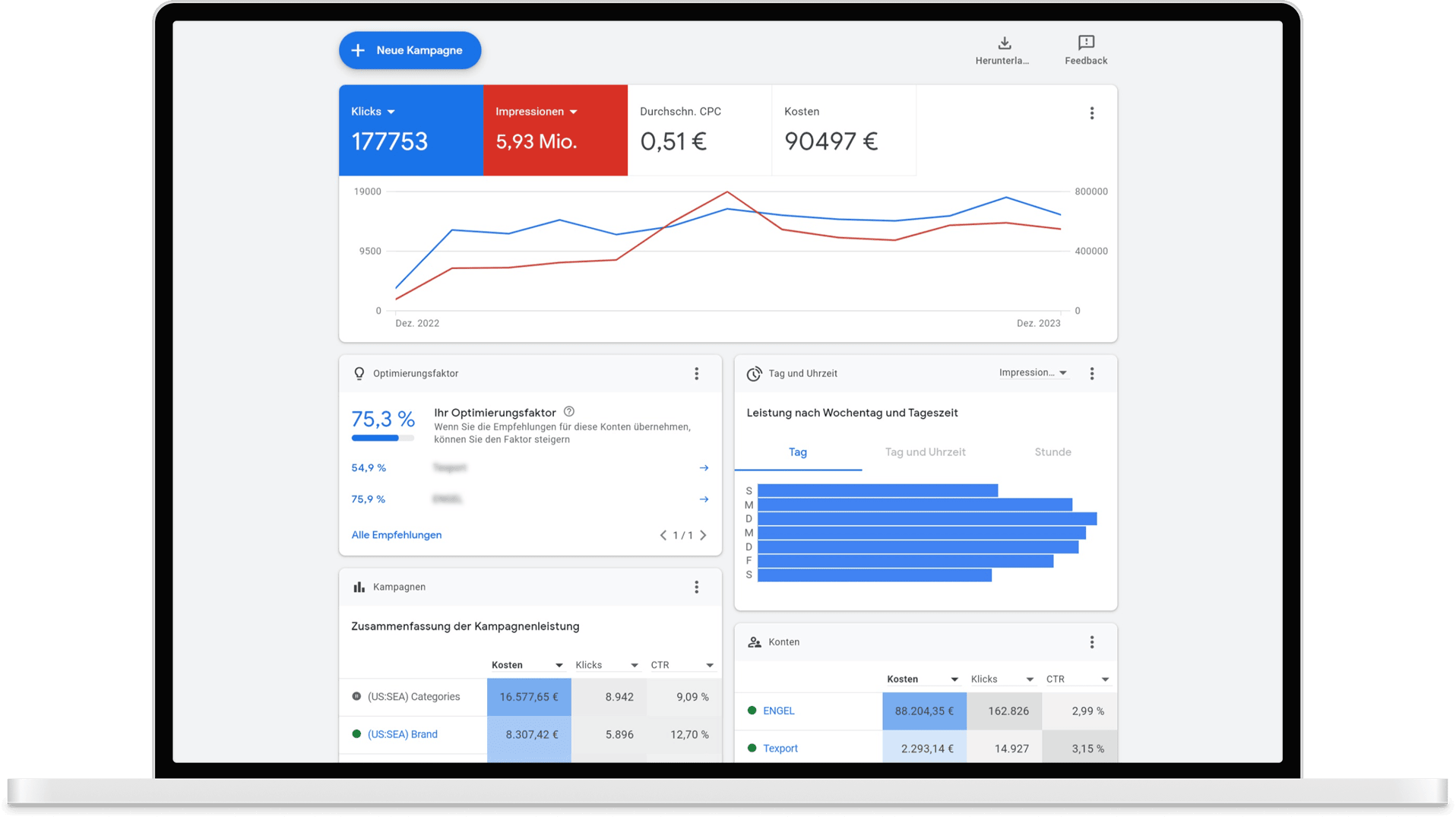 Die Preise für Google Ads sind flexibel und abhängig von deinen Erwartungen, dem Quality Score und deinem Budget. Eine gut performende Kampagne erfordert eine angemessene Budgetplanung und eine kluge Strategie.
